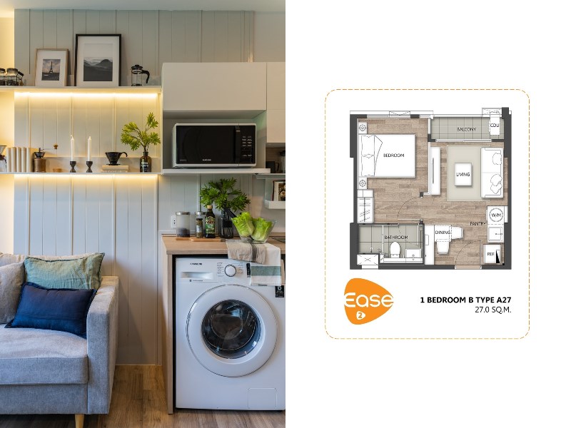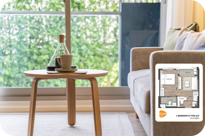 ห้องตัวอย่างแบบแรกเป็นแบบ 1 ห้องนอนที่มีขนาดพื้นที่เล็กที่สุดของโครงการ คือ 27 ตร.ม. ซึ่งผังจะเป็นตามตัวอย่างด้านล่าง คือเปิดประตูเข้าไปจะเป็นโซนครัว ประตูห้องอยู่ตรงกลางระหว่างโต๊ะทานข้าวกับส่วนทำอาหารแบบง่ายๆ ด้านในเป็นมุมรับแขกที่อยู่ติดกับริมระเบียง ส่วนซ้ายมือเป็นทางไปห้องนอนและห้องน้ำ