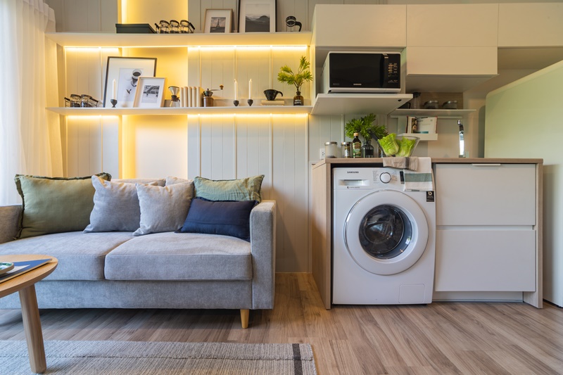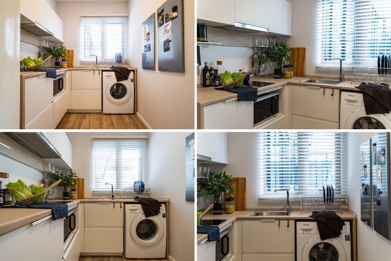 ในโซนครัวมีตู้บิวท์อินด้านบนและด้านล่างให้พร้อมเคาน์เตอร์สำหรับเตรียมอาหารซึ่งใหญ่กว่าห้องขนาด 27 ตร.ม. 1 เท่า เห็นได้จากมีพื้นที่ส่วนเตรียมอาหารและตู้ด้านบนและล่างเพิ่มขึ้นมาอีกอย่างละ 1 ช่อง พร้อมช่องสำหรับวางเครื่องซักผ้าขนาดมาตรฐาน