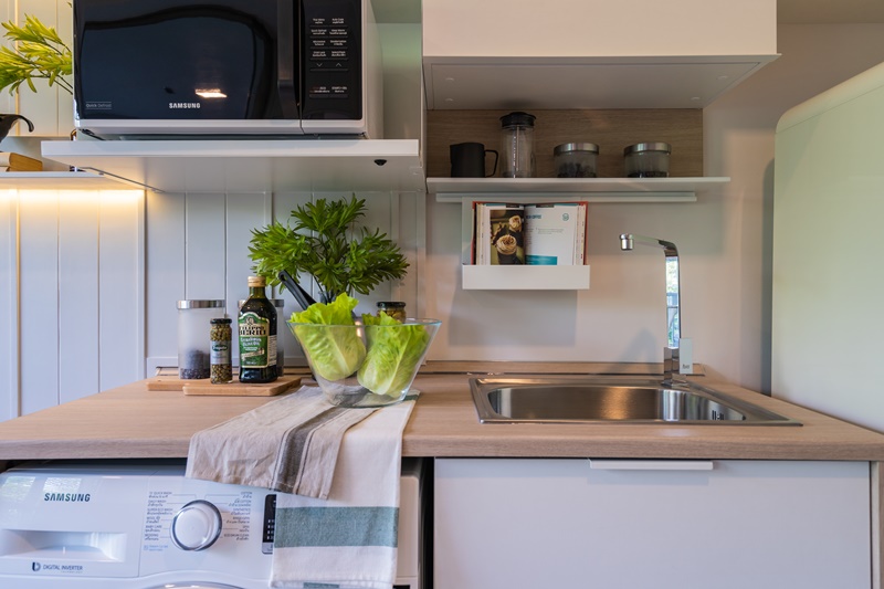 ซูมกันใกล้ๆ กับโซนครัวที่มาพร้อมบิวท์อินขนาดกะทัดรัดที่มีพื้นที่สำหรับเตรียมอาหาร 1 ช่อง และส่วนล้างทำความสะอาดอีก 1 ช่อง