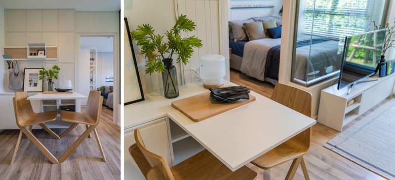 อีกฝั่งหนึ่งเป็นมุมวางโต๊ะอาหารแบบพับเก็บได้ ซึ่งมีขนาด 2 คนกำลังดี หรือถ้าไม่ได้ใช้งานก็พับเก็บปิดไว้ด้านหลังที่เป็นตู้บิวท์อินเก็บของได้