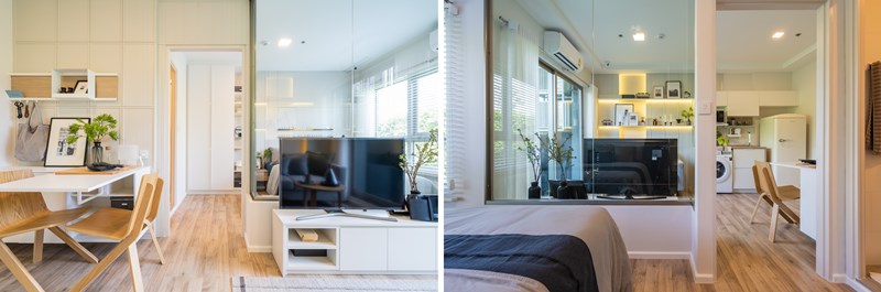 ส่วนฝั่งตรงข้ามมุมวางทีวีจะเป็นประตูกระจกบานเลื่อนเข้าห้องนอน ซึ่งวางโซฟาขนาด 2 คนได้กำลังพอดีกับขนาดประตู และยังมีพื้นที่ด้านข้างสำหรับโซฟาหรือเก้าอี้เล็กๆ ได้อีก หรือถ้าใครอยากย้ายชั้นวางทีวีมาแทนที่โซฟาก็ได้แต่จะไม่สามารถเจาะผนังติดชั้นบิวท์อินได้เพราะว่าติดประตูกระจก
