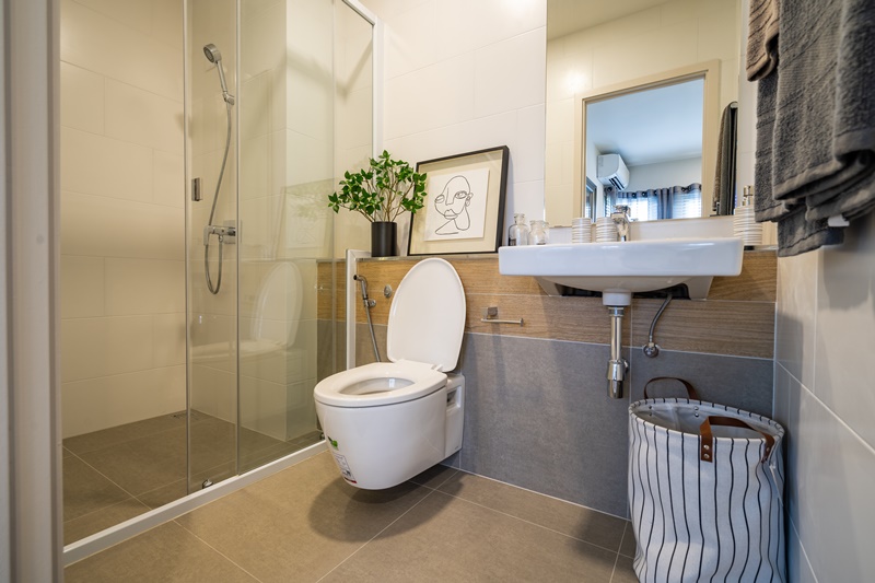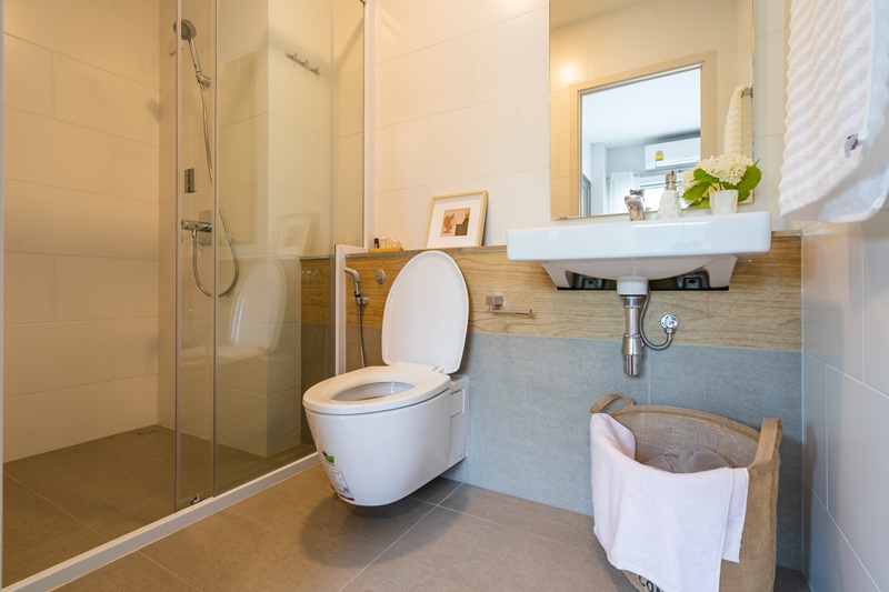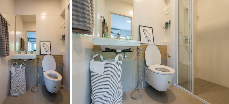 ภายในห้องน้ำก็เป็นดีไซน์เดียวกับ 2 แบบแรกที่รีวิวไป พร้อมด้วยสุขภัณฑ์ครบครัน งานดีไซน์เรียบๆ สีสว่างอ่อนๆ พร้อมประตูกั้นอาบน้ำแบบ 2 ตอน