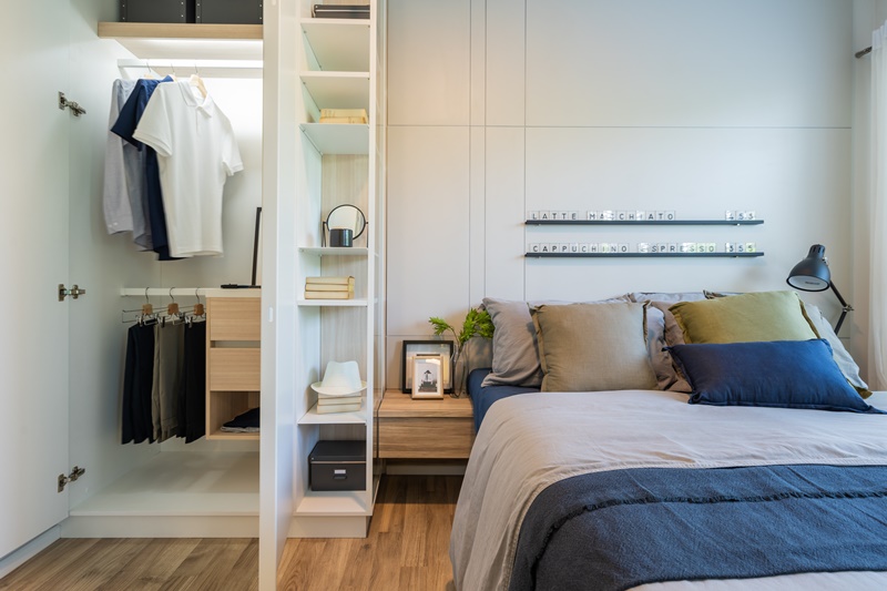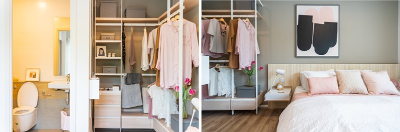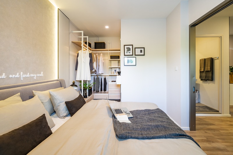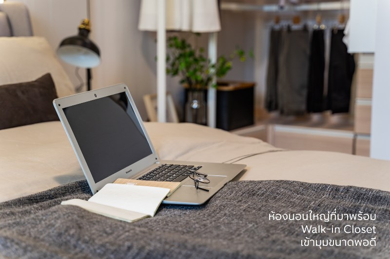 มาถึงส่วนไฮไลท์อย่างห้องนอนใหญ่ อย่างที่บอกไปว่าเป็นห้องนอนที่มาพร้อม Walk-in Closet หรือมุมแต่งตัวที่ดีไซน์ให้เข้ามุมหลบสายตาและมีความเป็นส่วนตัวค่อนข้างมาก