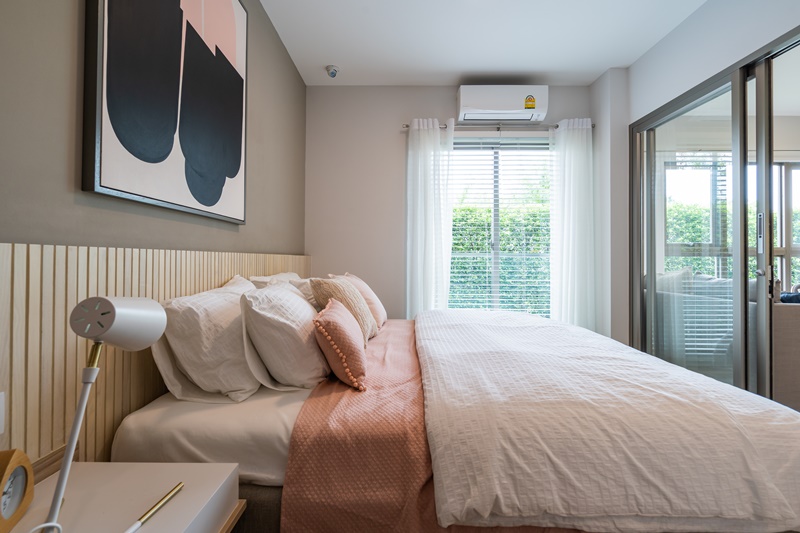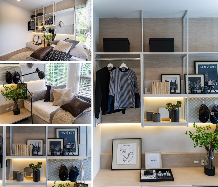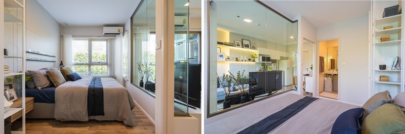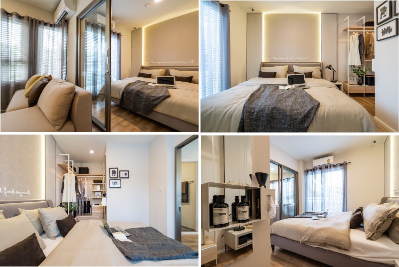 ส่วนภายในห้องนอน ขนาดพื้นที่พอใช้ได้ วางเตียงขนาดใหญ่ได้ พร้อมมีชั้นวางของบริเวณหัวเตียง โต๊ะข้างหัวเตียง ส่วนตู้เสื้อผ้าห้องตัวอย่างนั้นอาจจะเล็กไปนิดแต่ก็พอมีพื้นที่ให้ขยับขยายได้อยู่