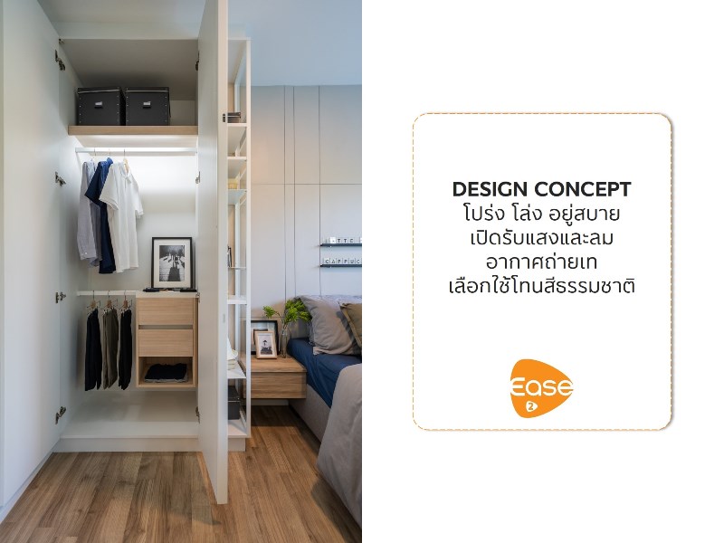 จากแบบห้องทั้ง 3 แบบ จะเห็นได้ว่าจุดเด่นของ EASE 2 พระราม 2 ที่ชัดมากๆ ก็คือความโปร่งโล่งของภายในห้อง ซึ่งส่วนหนึ่งน่าจะมาจากการเลือกใช้สีโทนอ่อนโดยเน้นสีที่ค่อนข้างอบอุ่น รับกับแสงที่ส่องเข้ามาภายในห้องผ่านหน้าต่างและช่องรับแสงที่มีรอบห้อง ช่วยเรื่องระบบการถ่ายเทอากาศและลดมุมอับได้เป็นอย่างดี