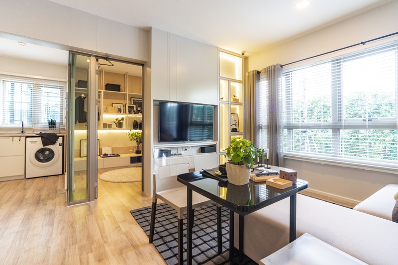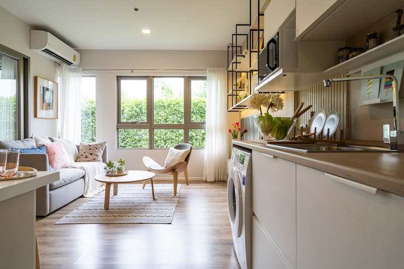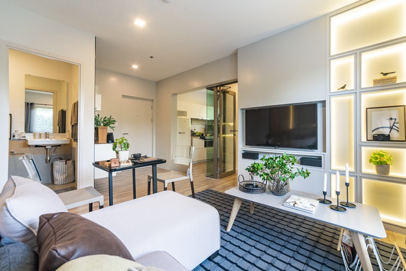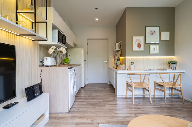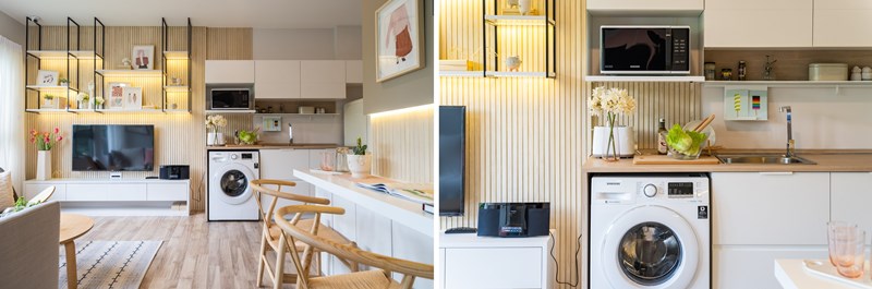 ด้านข้างโซนครัว ทางโครงการได้จัดให้ติดกับโต๊ะวางทีวีและชั้นบิวท์อินที่ลอยอยู่ด้านบน ซึ่งเอาเข้าจริงแล้ว ถ้าไม่ชอบให้ทีวีอยู่ติดโซนครัวก็สามารถขยับสลับที่กับตำแหน่งที่วางโซฟาได้