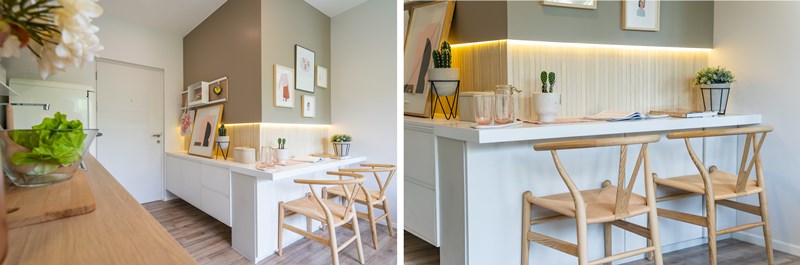อีกทั้งข้างตู้บิวท์อินก็เป็นโต๊ะทานข้าวแบบหันหน้าเข้าหากำแพง หรือจะปรับเปลี่ยนทำเป็นชั้นวางของก็ได้ในเวลาที่ไม่ได้ใช้งาน