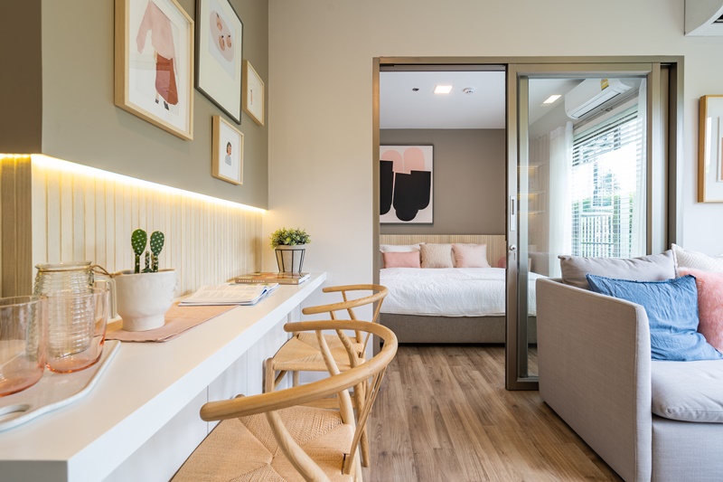 เริ่มจากมุมห้องรับแขกที่ออกแบบมาให้เป็นพื้นที่ส่วนกลางของห้องที่เปิดประตูเข้ามาก็เห็นพอดี และถือเป็นข้อดีในเวลาที่ต่างคนต่างอยู่ในห้องใครห้องมัน เพราะระยะห่างระหว่างห้องนอนทั้ง 2 ห้อง จะช่วยให้ไม่มีเสียงดังรบกวน