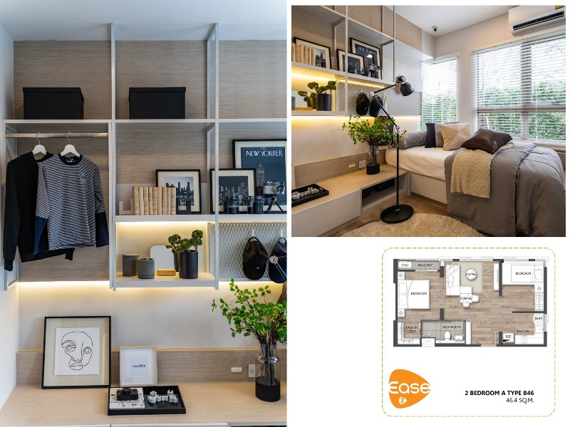 ปิดท้ายกันที่ห้องขนาด 46.4 ตร.ม. ที่มาพร้อมกับฟังก์ชั่นใช้งานที่เพิ่มเป็นอีกเกือบเท่าตัว มีห้องนอนใหญ่พร้อม Walk-in Closet 1 ห้อง ห้องนอนเล็ก 1 ห้อง โดยมีห้องรับแขกคั่นอยู่ตรงกลาง มีห้องน้ำส่วนกลางอยู่ด้านนอก 1 ห้อง และพื้นที่อีกส่วนที่เพิ่มขึ้นมาก็คือโซนครัว