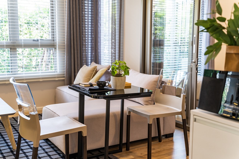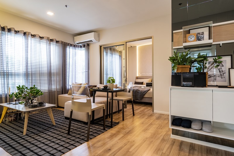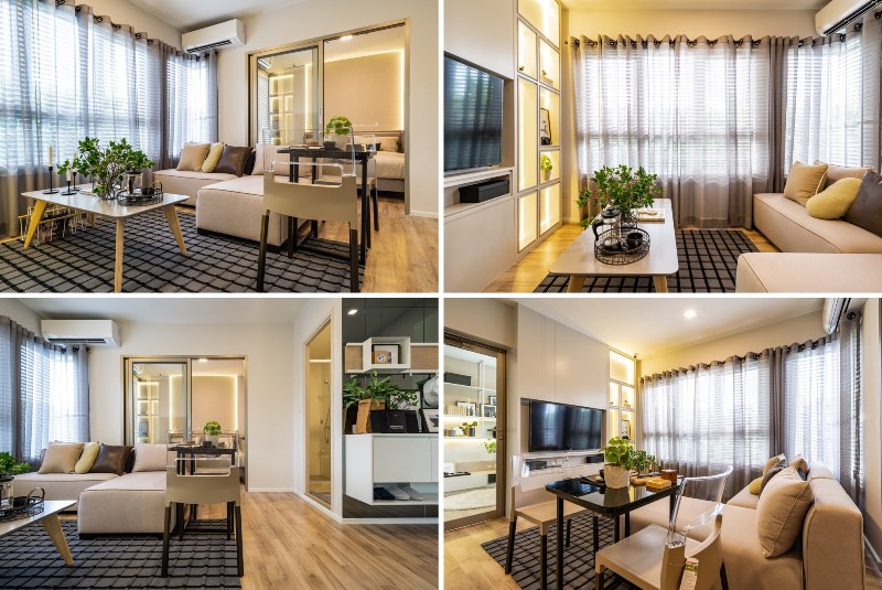 ส่วนของโต๊ะทานข้าว ทางโครงการจัดวางไว้ข้างโซฟาในห้องรับแขกซึ่งในความเป็นจริงอาจจะดูขวางๆ ไปสักนิด แต่ก็สามารถปรับขยับได้ตามความสะดวก เพราะถือว่าผังที่โครงการให้มาค่อนข้าง freestyle ปรับเปลี่ยนได้ตามชอบเลย หรือถ้าชอบห้องแบบโล่งมากๆ แนะนำให้เลือกใช้โต๊ะทานข้าวแบบพับเก็บได้