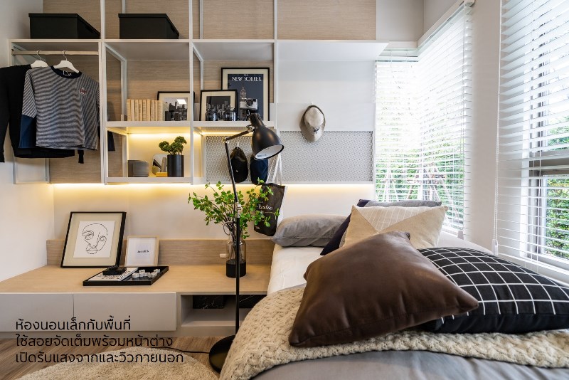 ปิดท้ายด้วยห้องนอนเล็ก ที่ถือว่าไม่เล็กนะ ขนาดกำลังดี ยิ่งถ้าวางเตียงเดี่ยวแบบตัวอย่างด้านล่างแล้วยิ่งโปร่ง หัวเตียงสามารถทำเป็นโต๊ะทำงาน วางชั้นหนังสือ ตู้เสื้อผ้า หรือโชว์ของรักของหวงได้ มีหน้าต่างยาวตลอดแนวห้อง ห้องเลยยิ่งดูโปร่งโล่ง สบายๆ