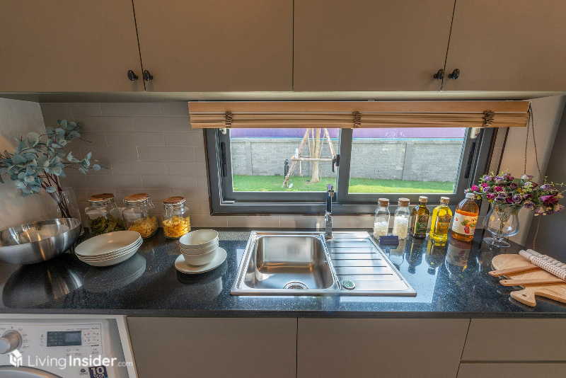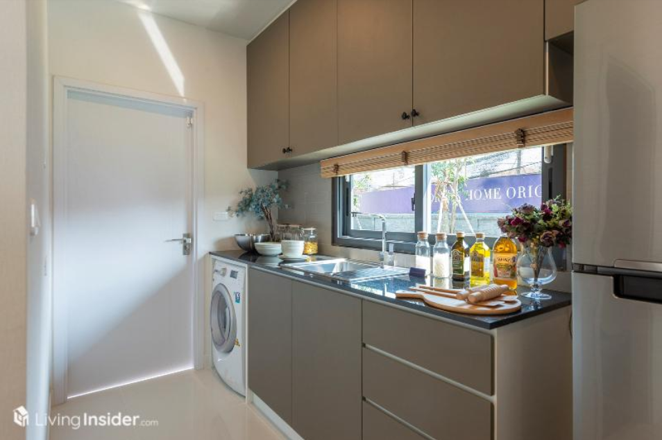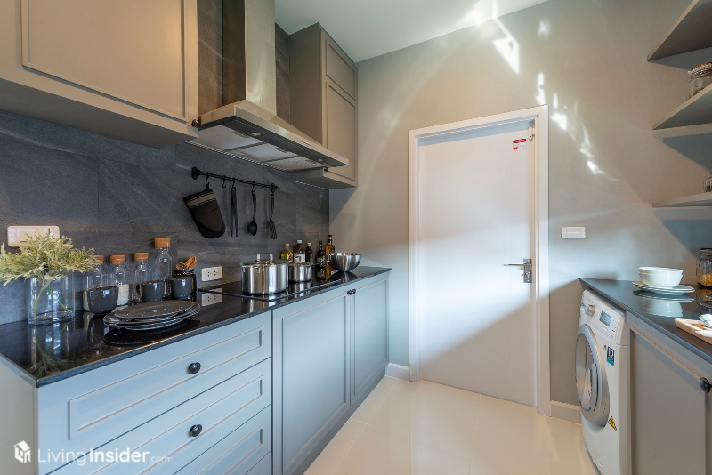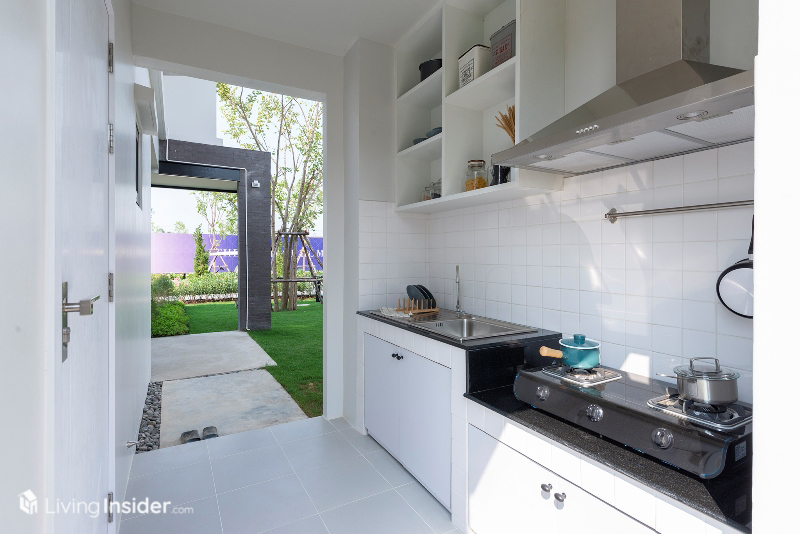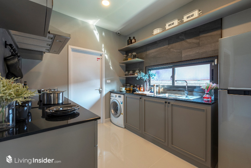 พื้นที่ครัวบิวท์อิน Pantry ตามบ้านตัวอย่างใช้ Top หินสังเคราะห์ สำหรับเตรียมอาหารเหมาะกับทำอาหารมื้อเล็กๆ ไม่หนักมากนัก ละมีซิงค์ล้างจาน พร้อมที่พักจาน เว้นจุดวางเครื่องซักผ้า ตู้เย็น 2 ประตูพอดีๆ