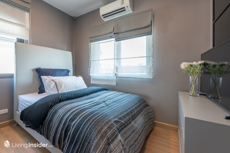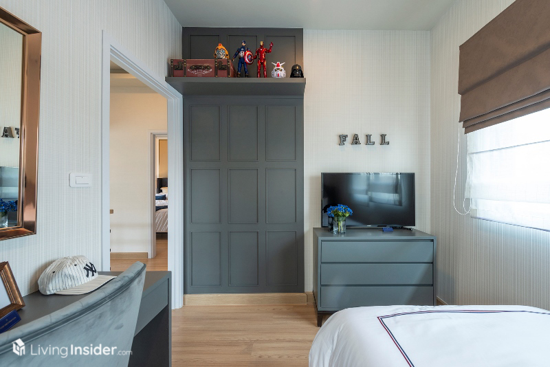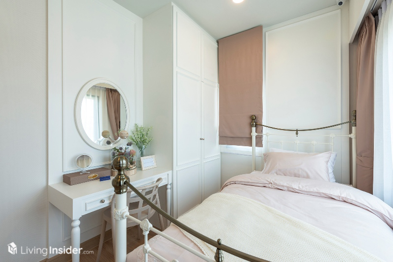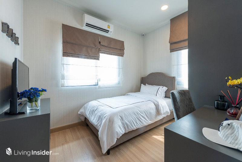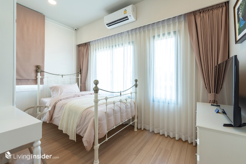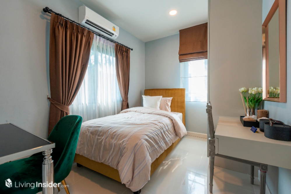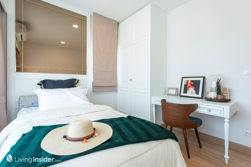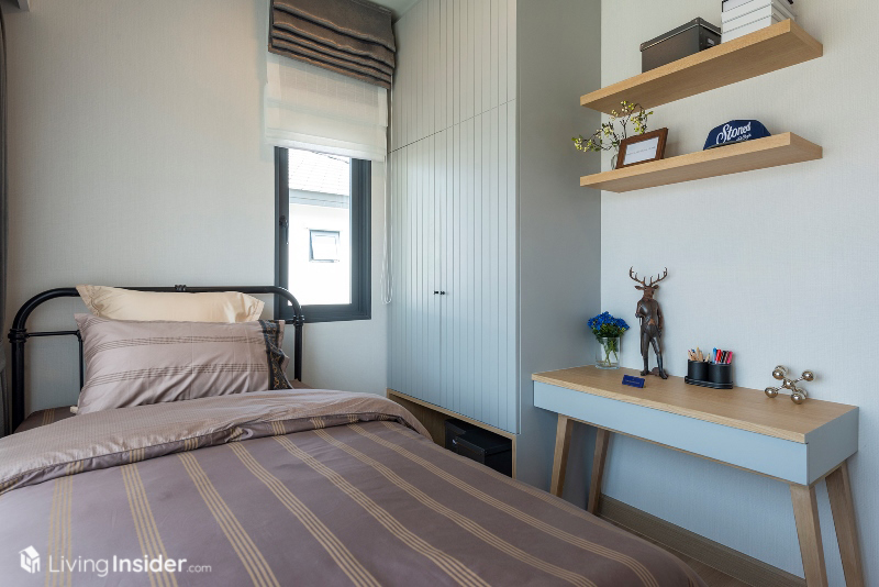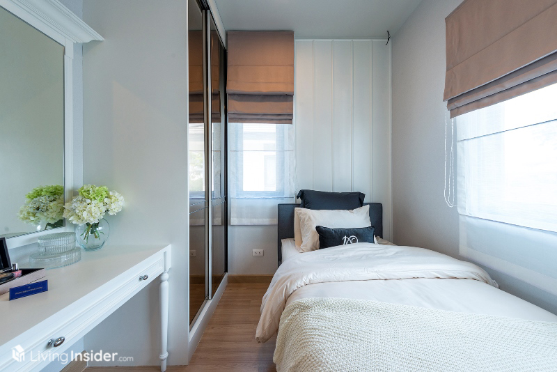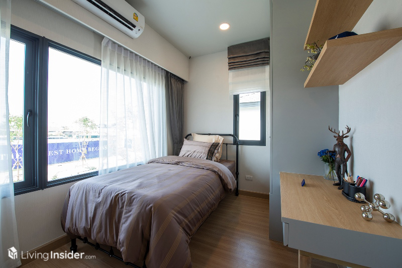 ส่วนห้องนอนเล็ก แบ่งเป็น 2 ห้องย่อย วางเตียงขนาด 3.5 ฟุต รวมถึงมีบิวท์อินตู้เสื้อผ้า โต๊ะทำงาน และพื้นที่แขวนทีวีผนังได้ อีกทั้งยังมีหน้าต่างขนาดพอเหมาะเพื่อให้ห้องพักผ่อนของลูกๆ ดูมีชีวิตชีวามากขึ้น เหมาะกับทำให้บุตรหลานครับ
