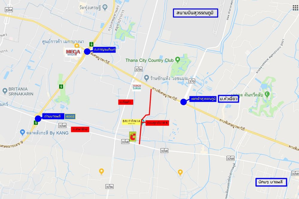 Britania (บริทาเนีย) บางนา กม.12 ติด ถ.สุขาภิบาล 6 (ซอยวัดหลวงพ่อโต) สามารถเข้าได้ 3 ทางคือ ถ.เทพารักษ์ - ถ.บางนา-ตราด และ ถ.กิ่งแก้ว (3256) เป็นถนน 4 เลนครับ มีหมู่บ้านจัดสรร โรงงาน สถานที่ราชการหลายแห่ง