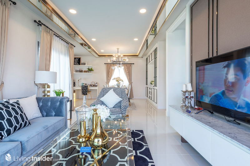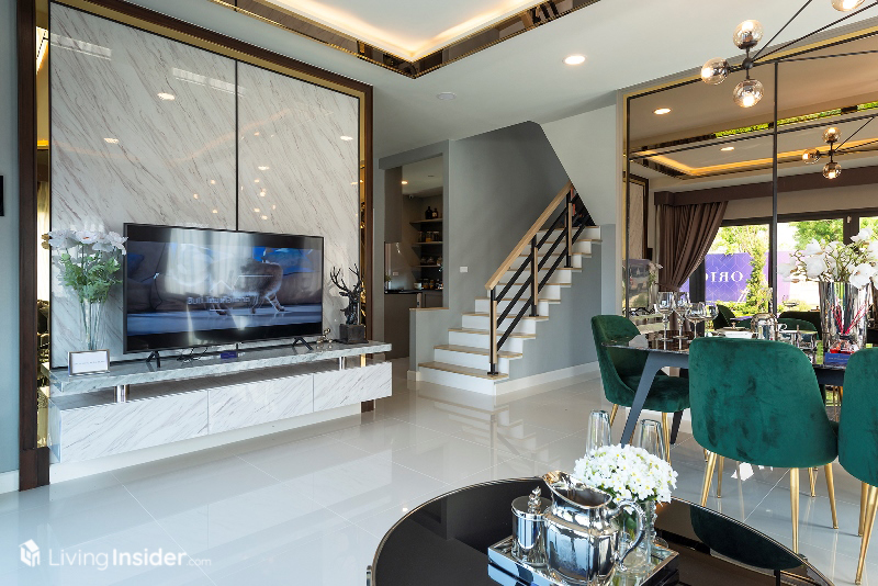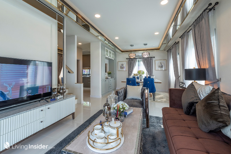 บ้าน Oxford แบ่งเป็น 4 ห้องนอน 3 ห้องน้ำ จอดรถ 2 คัน เปิดเข้ามาพบกับห้องนั่งเล่นครับ จัดโซฟา โต๊ะกลาง ชั้นวางทีวีที่บอกเลยว่ากว้างมากๆ ขนาดวางโซฟา โต๊ะ ทีวีแล้ว ยังมีพื้นที่เหลือใช้สอยอย่างอื่นได้อีกด้วยอีกทั้งมีพื้นที่วางโต๊ะทานอาหาร 4-6 ที่นั่งได้สบายๆ