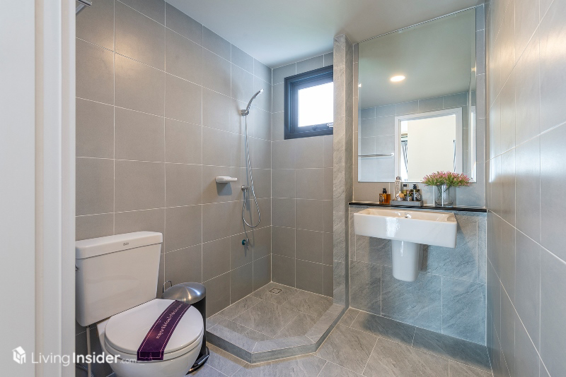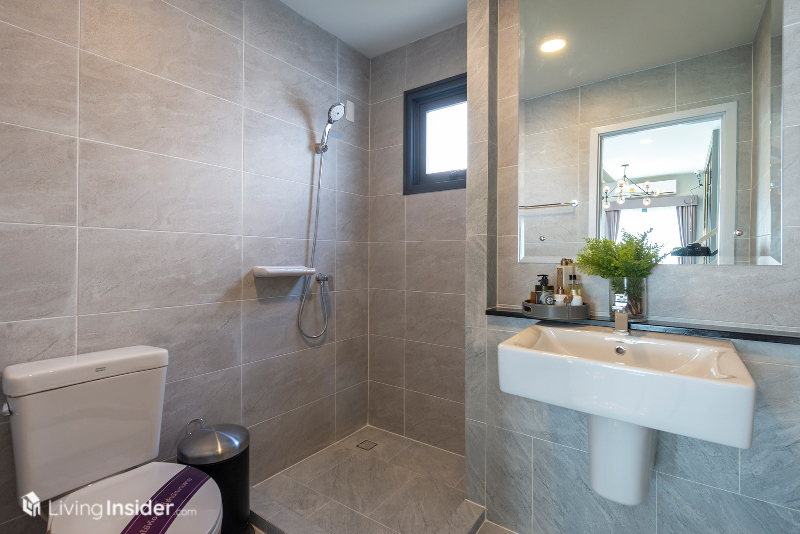 ส่วนห้องน้ำตกแต่งด้วยกระเบื้องสเปคเดียวกับบ้าน Brompton - Regent มีการแยกโซนเปียก แห้งได้อย่างลงตัว สามารถต่อเติมเป็นกระจกกั้นในส่วนนี้ได้