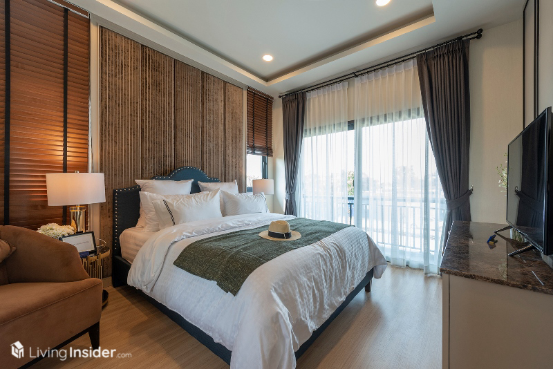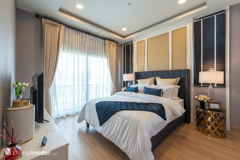สำหรับ Master Bedroom วางเตียง King Size ได้แล้ว พร้อมทั้งแขวนทีวีผนัง บิวท์อินตู้เสื้อผ้า โต๊ะแต่งตัว มีห้องน้ำและระเบียงในตัวครับ เป็นส่วนห้องนอนหลักที่มีขนาดกว้างขวางจัดเต็มทุกฟังก์ชั่นจริงๆ