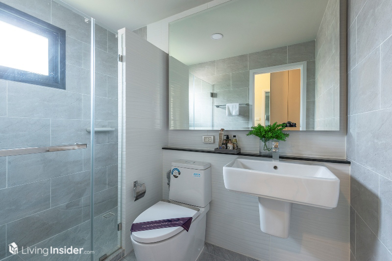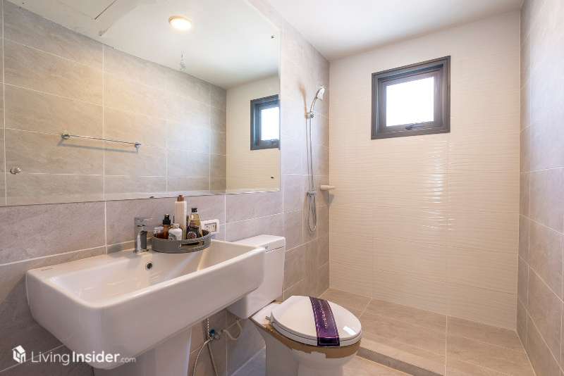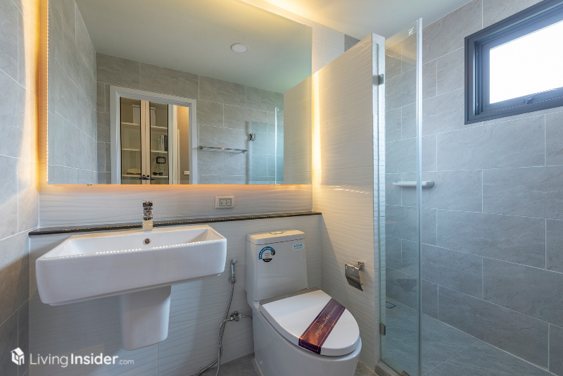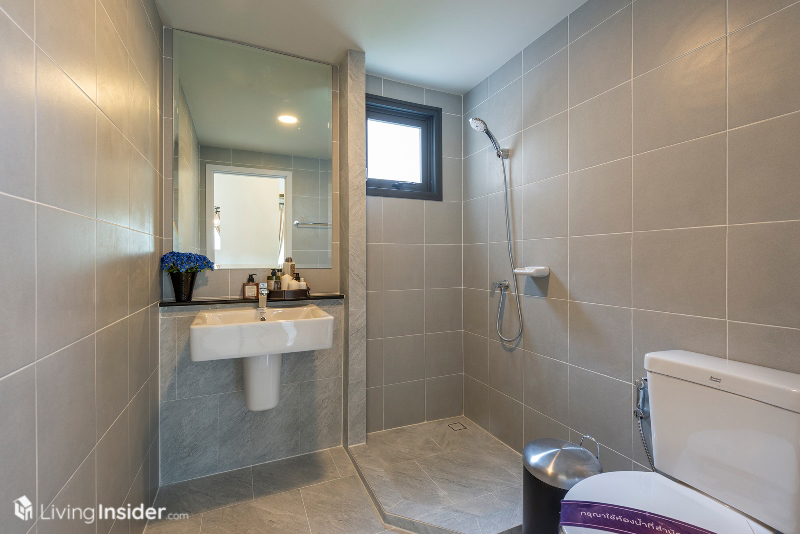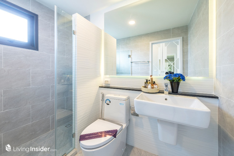 มีห้องน้ำในตัวมีการกั้นโซนแห้ง เปียก ด้วยกระจกพร้อมติดตั้งกระจกบานใหญ่ช่วยให้ห้องน้ำดูโปร่ง กว้างขึ้นทันตา