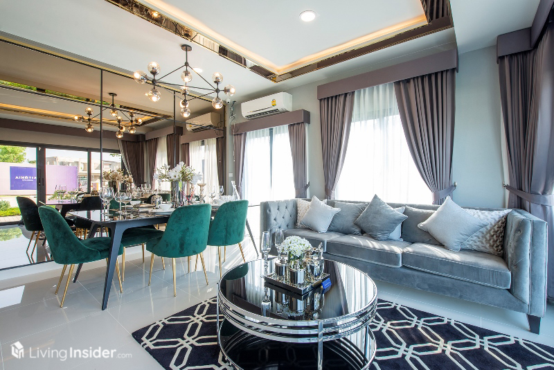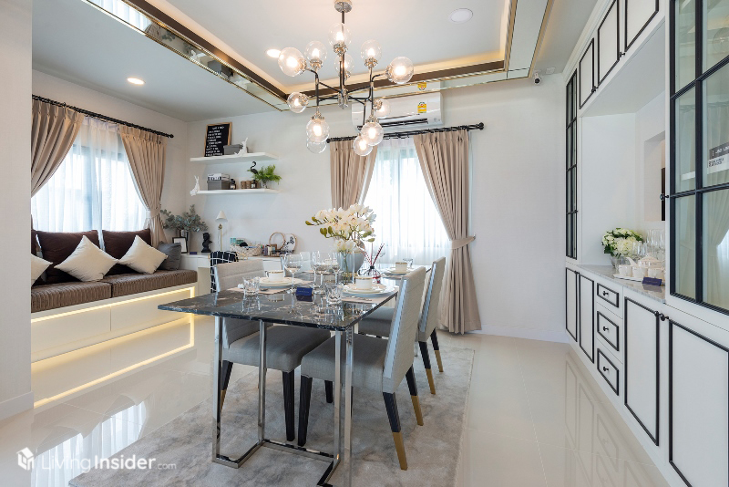 ด้านในแบ่งเป็นส่วนรับประทานอาหาร บ้านตัวอย่างจัดเป็นส่วนพักผ่อนครับ สามารถปรับเปลี่ยนตามความต้องการ ทำเป็นห้องทำงานก็ได้เหมือนกัน
