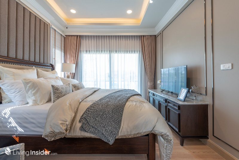 ห้องนอนอยู่ชั้น 2 ทั้งหมด แบ่งเป็น Master Bedroom ที่สามารถวางเตียงขนาด 5 ฟุตได้สบายๆ พร้อมที่แขวนทีวีติดผนัง รวมถึงวางโคมไฟ เก้าอี้พักผ่อนได้อย่างลงตัว
