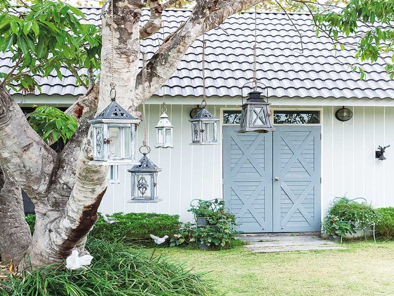 ประตูบ้านแบบนี้นี่ถ้าใครชอบแนวคันทรี อยู่กับทุ่งอยู่กับม้ากับวัวนี่ต้องชอบแน่ๆ ครับ เพราะเป็นประตูที่มีลักษณะคล้ายๆประตูโรงนาในต่างจังหวัดสมัยก่อนเลยครับ เป็นประตูไม้แบบสองบานติดกันทาด้วยสีครามเพิ่มความรู้สึกสงบ เข้ากับผนังด้านนอกของตัวบ้านสีเทาตัดขาว ได้ฟีลบ้านต่างจังหวัด อยู่กับนกกับไม้และสัตว์ในฟาร์มเลยครับ