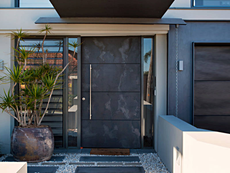 ประตูบ้านแบบนี้จะใช้เหล็กเป็นวัสดุจึงโดดเด่นที่ความดิบและเท่อย่างแรงเลยครับ แล้วยิ่งมีลายสนิมและราวจับสีทองเพิ่มเข้าไป ก็จะยิ่งทำให้รู้สึกมีพลังขึ้นอีกเท่าตัว ประตูเหล็กแบบนี้เหมาะสำหรับคนชอบสไตล์ลอฟท์หรือชอบการแต่งบ้านเน้นความแข็งแรง ยิ่งมีรั้วเป็นเหล็กสีดำหรือเหล็กดัดสีดำร่วมด้วย ก็จะช่วยขับความโดดเด่นออกมาได้อีกมากเลยครับ
