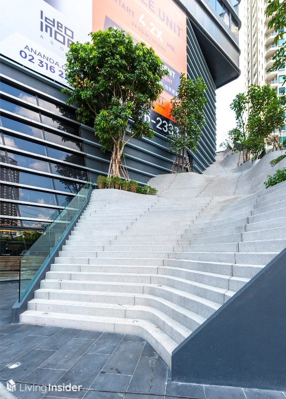 ด้านหลังโครงการคือ Dynamic Garden ติดคลองแสนแสบ และไฮไลท์เด่นก็คือ ‘Urban Trail Running’ บันไดซิกแซกสามารถออกกำลังกายและเชื่อมต่อขึ้นไปยังสวนส่วนกลางชั้น 7 ได้ Shape ของบันไดมีเสน่ห์มากๆ ครับ