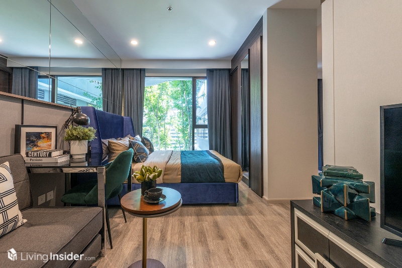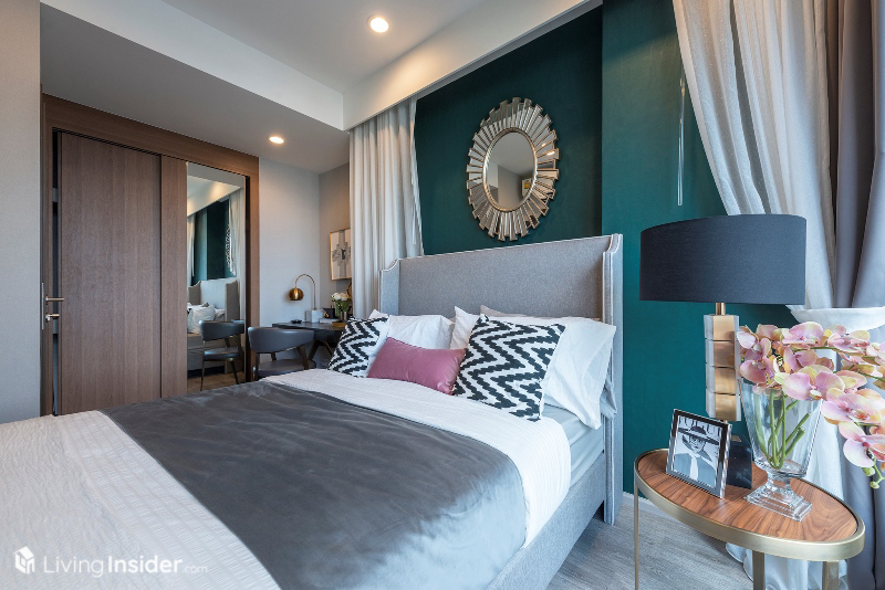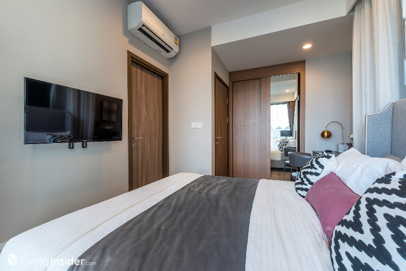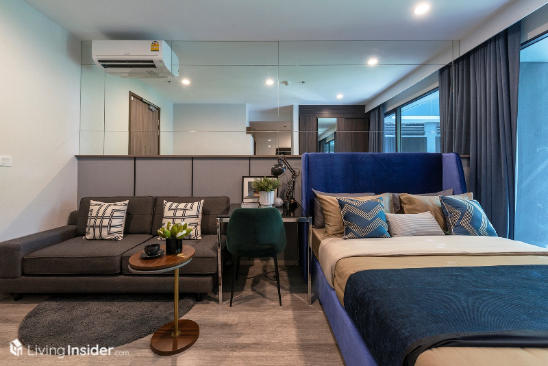 ห้องนอนกั้นทึบเพิ่มความเป็นส่วนตัวมีพื้นที่ให้วางเตียงขนาด 5 ฟุต โต๊ะทำงาน ตู้เสื้อผ้า ได้สบายๆ ยังพอมีพื้นที่เหลือรอบๆ เตียงพอเดินได้สะดวกครับ สามารถแขวนทีวีติดผนังเพิ่มเติมตามต้องการ อีกทั้งยังมีกระจกบานใหญ่ให้เทควิวเมืองได้เต็มๆ ขณะพักผ่อน