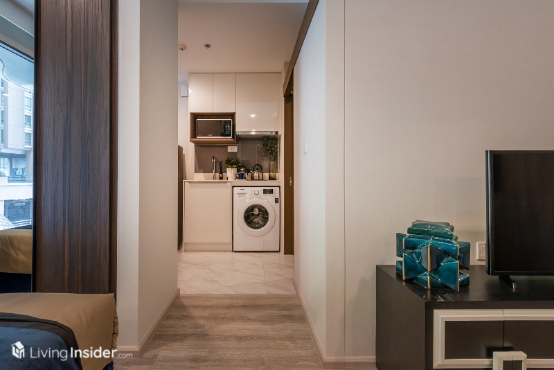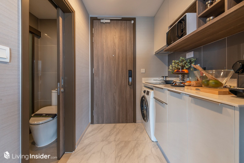 เข้ามาจะพบกับพื้นที่ครัวพร้อมบิวท์อิน Pantry ขนาดกำลังดี รวมถึงมีชั้นเก็บของติดผนังช่วยประหยัดพื้นที่ได้อีก ในส่วนนี้จะเน้นเตรียมอาหาร หรือทำอาหารมื้อเล็กๆ มีการเว้นช่องว่างสำหรับวางเครื่องซักผ้า ส่วนพื้นที่วางตู้เย็นจะอยู่ฝั่งตรงข้าม