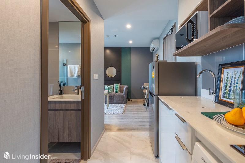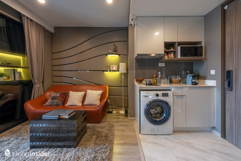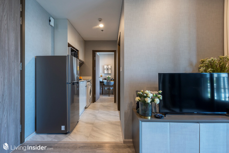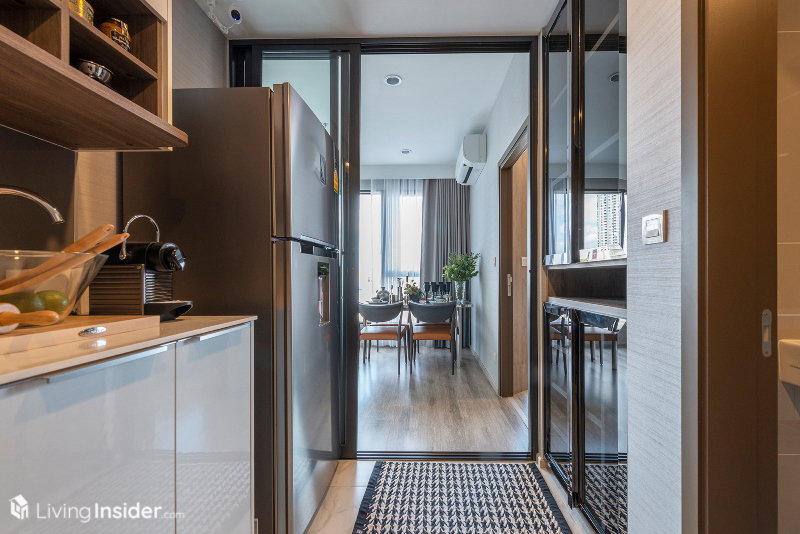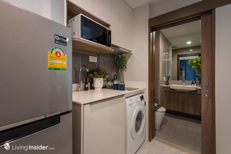 เปิดห้องมาพบกับพื้นที่ครัว เป็นครัวปิดครับสามารถประกอบอาหารมื้อเล็กๆ ได้สบายๆ รวมถึงเว้นพื้นที่วางเครื่องซักผ้า ตู้เย็นขนาด 2 ประตูเช่นเคยเหมือนยูนิต 1-Bedroom