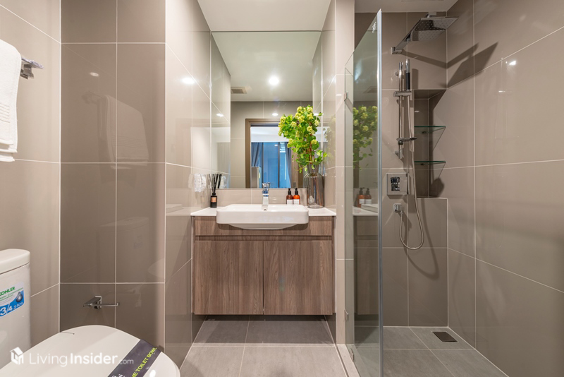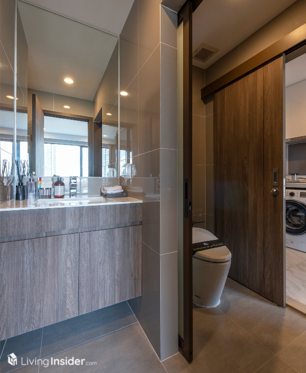 ส่วนห้องน้ำสามารถเข้าจากครัวและห้องนอนได้เช่นเคย มีการกั้นโซนเปียก แห้ง ได้อย่างลงตัวพร้อมกระจกบานใหญ่ช่วยเพิ่มมิติให้กับห้องน้ำดูโปร่งโล่งขึ้น