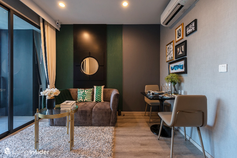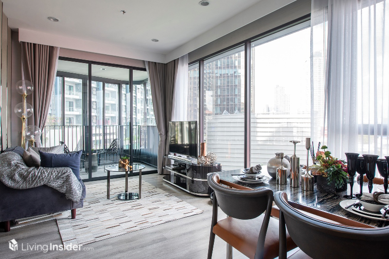 ในส่วน Living Zone มีขนาดกว้างขวางมากมาพร้อมกับกระจกเต็มบานตลอดแนวบรรยากาศโปร่งโล่ง เทควิวด้านนอกเต็มตาส่วนนี้จัดโต๊ะทานอาหาร 3-4 ที่นั่ง โซฟาครอบครัว ระยะห่างทีวีราว 2.2-2.3 เมตร เป็นข้อดีของยูนิตขนาดใหญ่จริงๆ เรียกได้ว่าใครชอบชมวิวเมืองอันนี้ตอบโจทย์ได้เต็มๆ เลยล่ะครับ