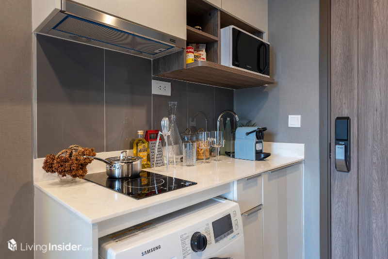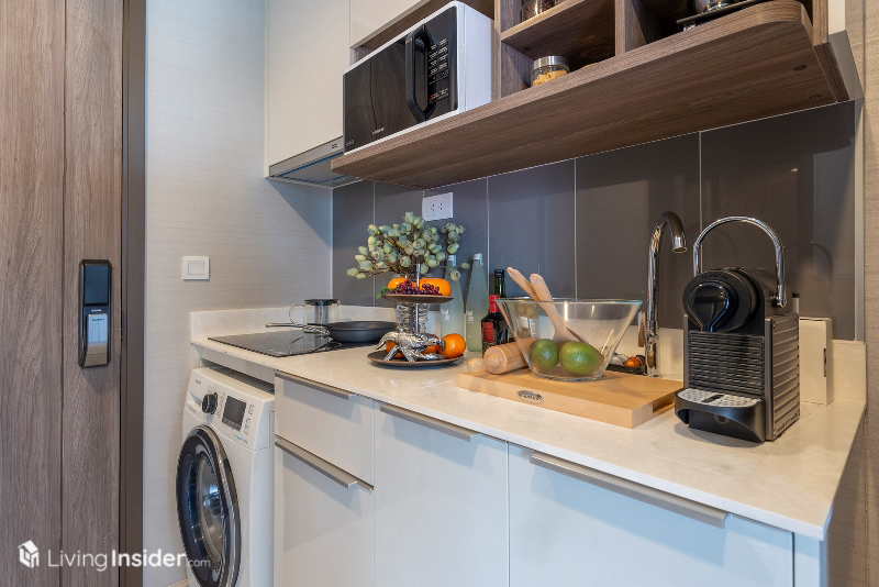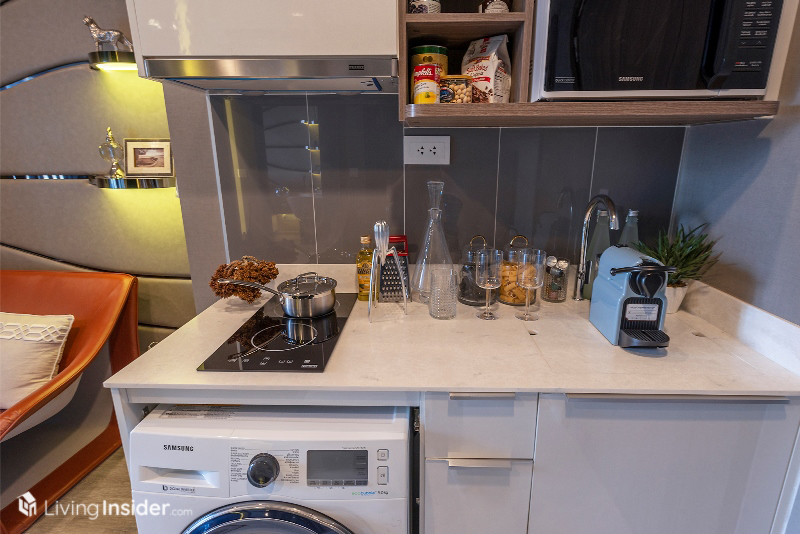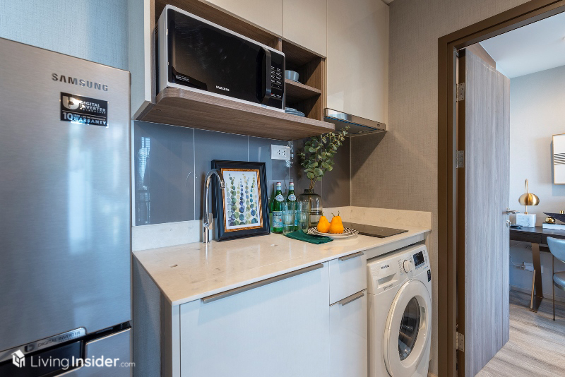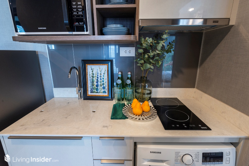 พื้นที่ครัวขนาดย่อมเหมาะกับทำอาหารมื้อเล็กๆ พร้อมมีเตาไฟฟ้า เครื่องดูดควัน ซิงค์หลุม และเว้นช่องวางเครื่องซักผ้า ตู้เย็น 2 ประตูได้อย่างลงตัว มีบิวท์อินตู้เก็บของติดผนังช่วยเพิ่มพื้นที่เก็บของได้อีกเยอะเลยทีเดียว