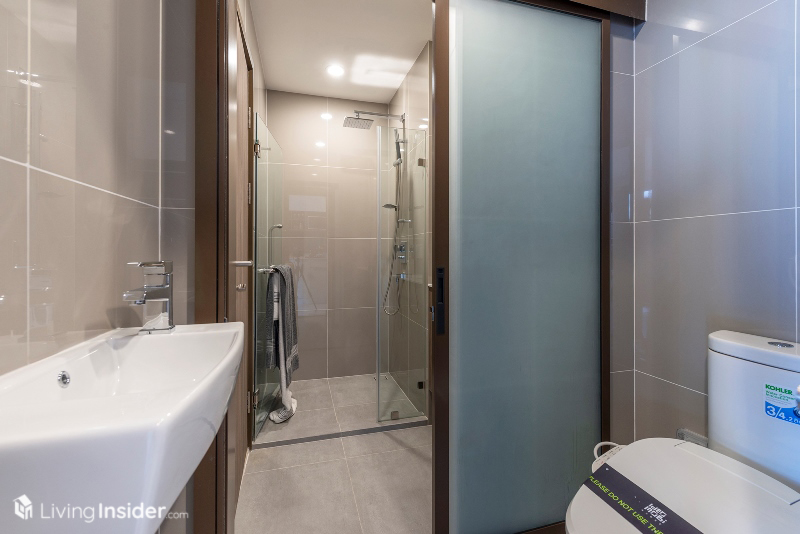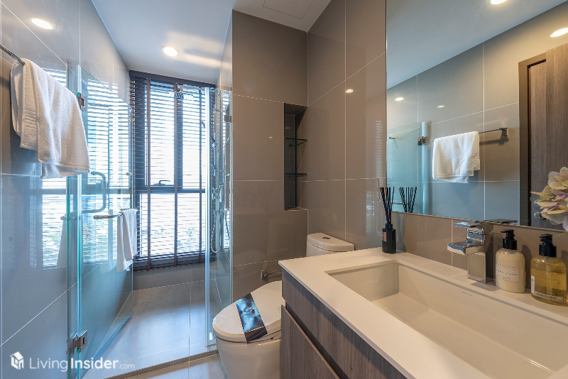 ส่วนของห้องน้ำสามารถเข้าได้จากส่วนครัวและห้องนอน (Double-Access) มีพื้นที่ใช้สอยมากขึ้นพร้อมประตูกระจกกั้นส่วนเปียก-แห้ง และยังมีมีหน้าต่างระบายอากาศด้วยนะ