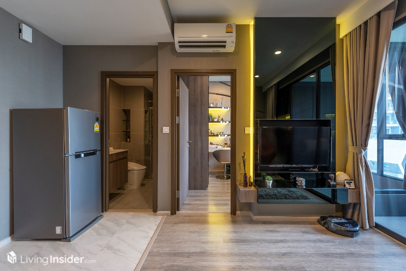 มาดูในห้องกันครับ เข้ามาพบกับส่วน Living Zone ที่มีพื้นที่ให้วางโซฟาขนาด 2 ที่นั่งได้พร้อมระยะห่างจากทีวีราว 2 เมตรเพื่อใช้วางโต๊ะอเนกประสงค์พร้อมเก้าอี้ได้สบายๆ และยังเหลือพื้นที่ใช้สอยเหลืออีกด้วย