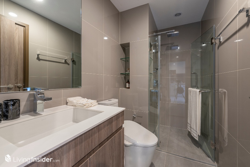 ห้องน้ำมาแบบ Function His&Her สามารถทำกิจกรรมพร้อมๆ กันได้อย่างไม่อึดอัด มีการแบ่งโซนอย่างชัดเจน ต่างจาก 1-Bedroom พอสมควรครับ โดยในส่วนนี้สามารถเข้าได้ 2 ทางทั้งส่วนห้องครัวและส่วนห้องนอน