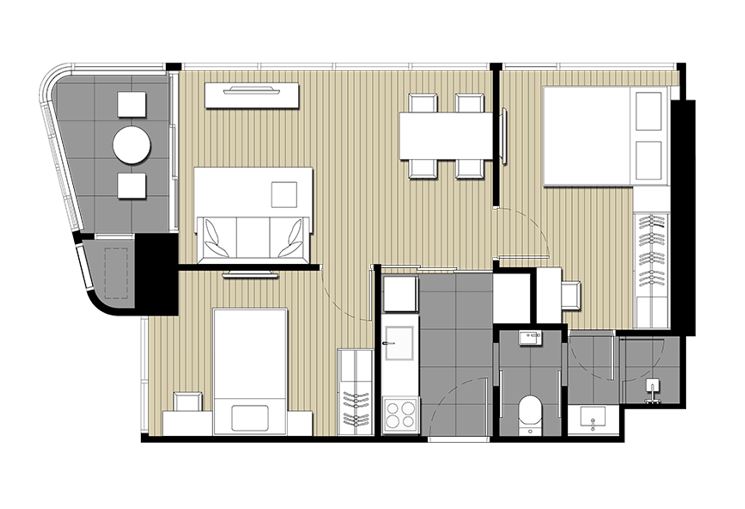 โครงการนี้มีความพิเศษอย่างนึงคือแบบ 2-Bedroom ทุกยูนิตเป็น ‘Corner Unit’ พร้อมกระจกโค้งเข้ามุม เทควิวได้เต็มตา 2 ด้าน สำหรับ Type C1 แบ่งเป็น 2 ห้องนอน 1 ห้องน้ำ เหมาะกับอาศัย 2-3 คนครับ แบ่ง Layout ลงตัว เน้นพื้นที่ Living กว้างเป็นพิเศษ
