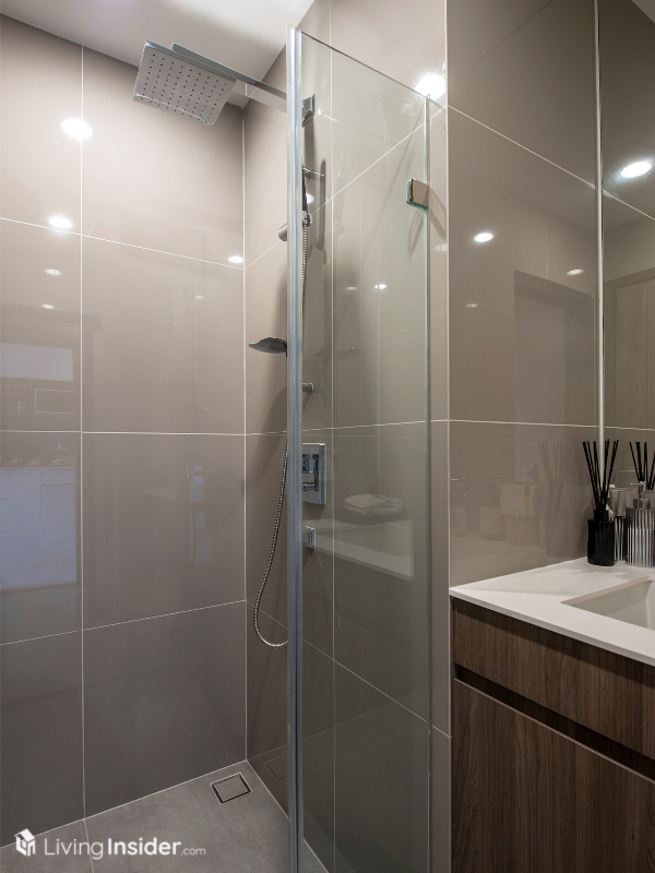 ห้องน้ำเป็นประตูบานเลื่อนจัดพื้นที่ใช้สอยได้อย่างลงตัว พร้อมมีฉากกั้นโซนเปียกโดยใช้กระจกเงาบานใหญ่ พร้อมมีตู้เก็บของและเซาะผนังวางของใช้ส่วนตัวได้อีกด้วย