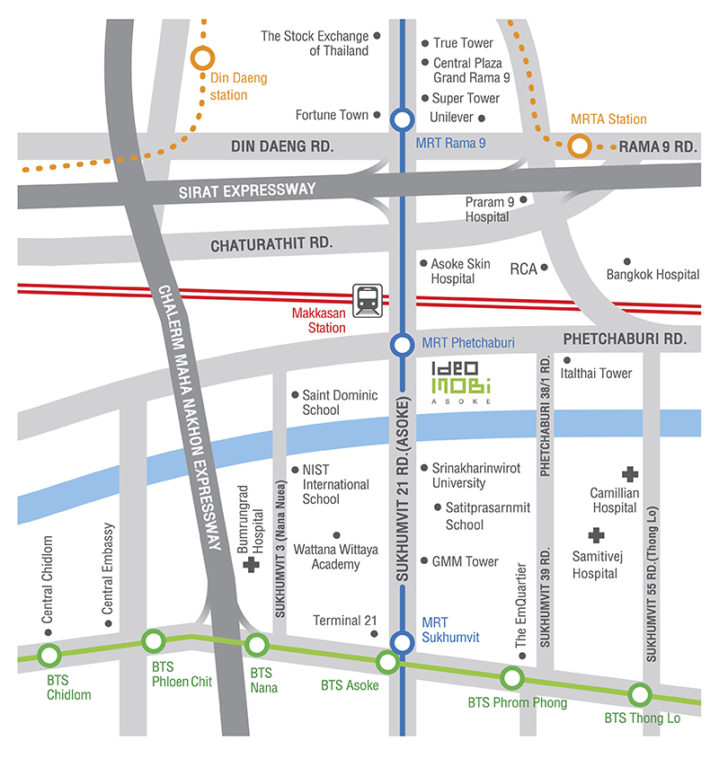 Ideo Mobi อโศก ห่างจาก แยกอโศก-เพชรบุรี (250 เมตร) ติดโครงการ Supalai Premier Asoke สังเกตไม่ยากครับ ออกจากโครงการสามารถเลี้ยวซ้ายเข้า ถ.อโศกมนตรีหรือแทรกขวาเข้า ถ.รัชดาภิเษก ได้เช่นกัน