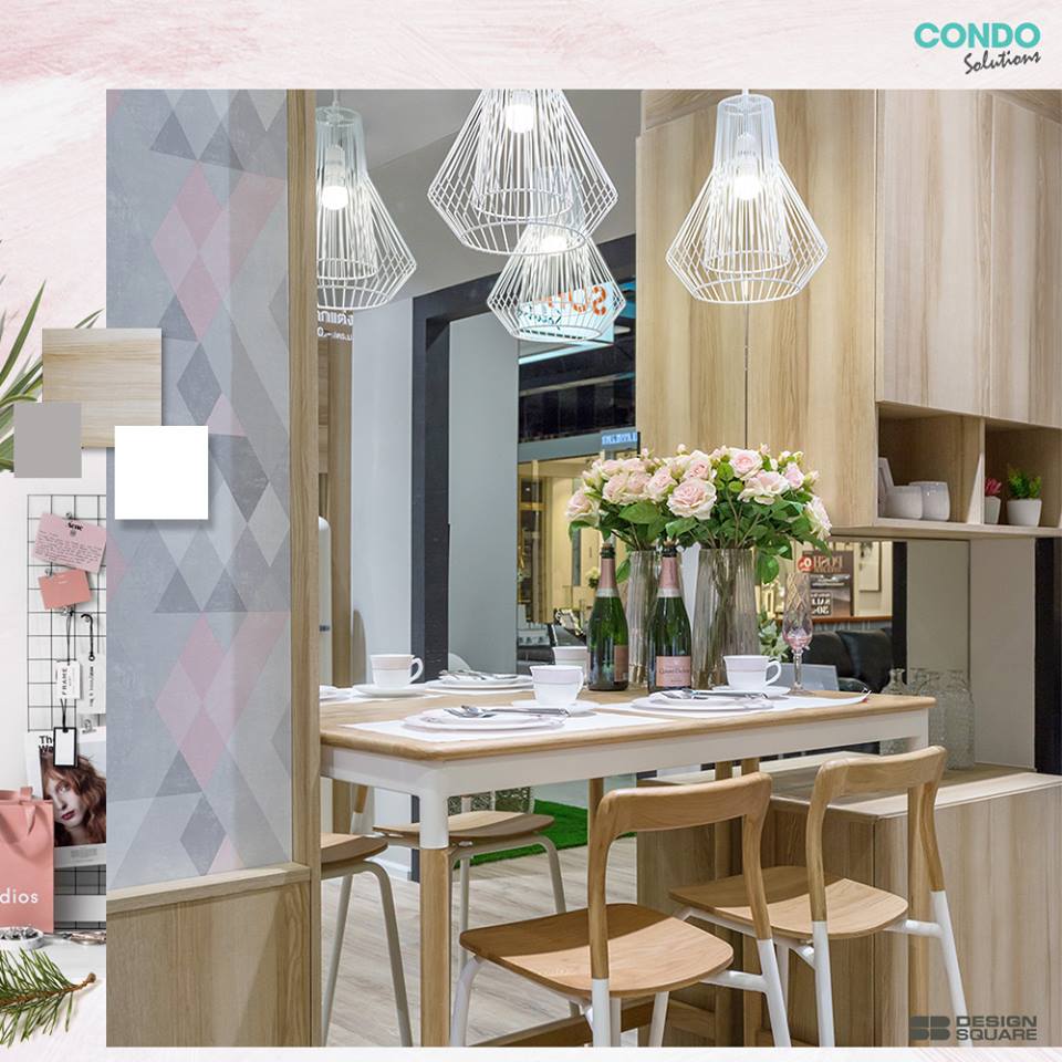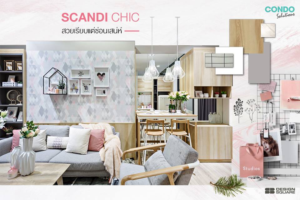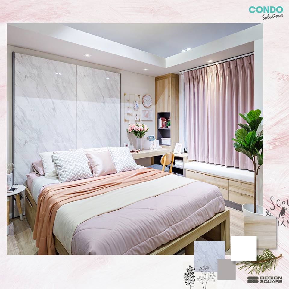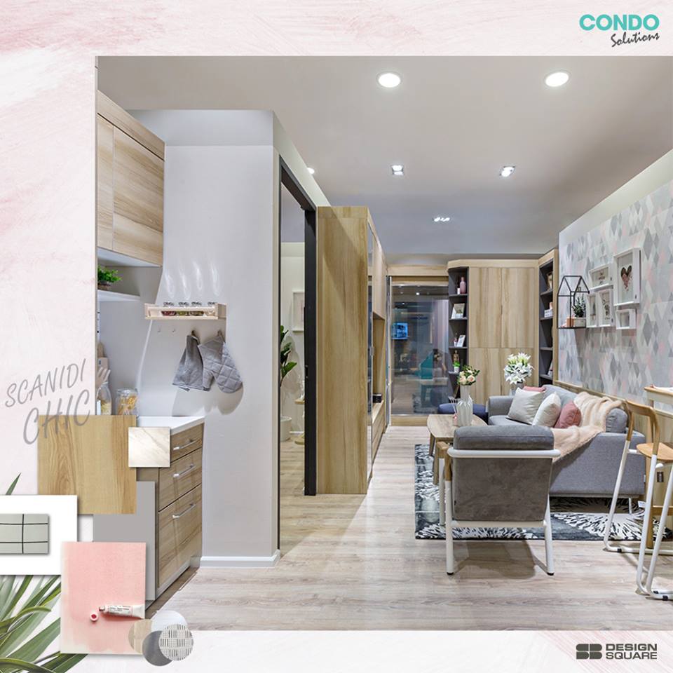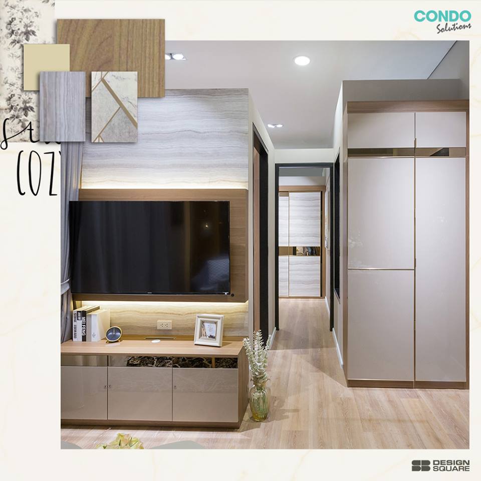 อีกหนึ่งโครงการที่ทาง Condo Solutions ได้ทำการออกแบบในสไตล์ Scandinavian ออกมาได้น่าอบอุ่นแฝงด้วยความน่ารัก ด้วยการตกแต่งขนาด 33.7 ตร.ม. โดยจะเน้นการออกแบบด้วยการใช้วัสดุไม้โทนสีอ่อนกับสีขาวเป็นหลักล้อไปกับเฟอร์นิเจอร์สีเทาเรียบๆ แต่มีการเพิ่มลูกเล่นด้วยสีพาสเทลเล็กๆ ช่วยเพิ่มความหวานให้กับคอนโดฯ ได้ยิ่งขึ้น ส่วนเฟอร์นิเจอร์เลือกใช้บิวท์อินท์ชั้นวางทีวีขนาดใหญ่ที่ซ่อนช่องจัดเก็บสิ่งของได้เยอะเลยทีเดียว รวมถึงการกั้นโซนห้องจะเลือกใช้ประตูกั้นห้องแบบรางแขวนลดปัญหาพื้นชำรุดเมื่อเลื่อนประตู