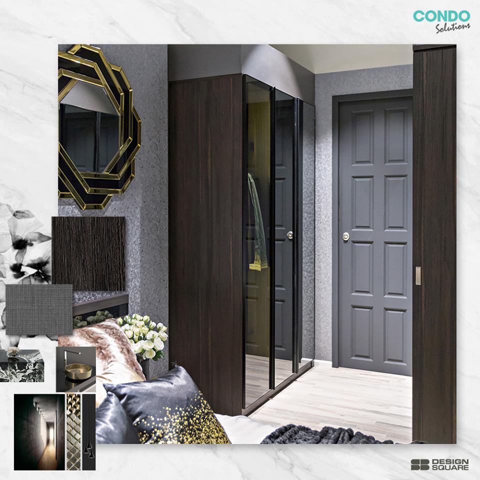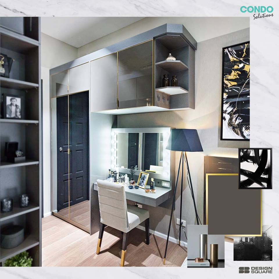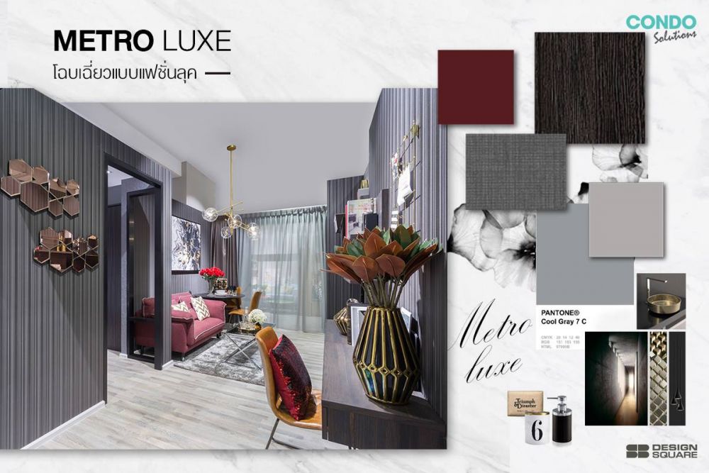 เป็นสไตล์ Metro Luxe ออกมาได้น่าค้นหามากๆ ด้วยการตกแต่งคอนโดขนาด 33.5 ตร.ม. โดยจะเน้นการออกแบบด้วยการเน้นใช้โทนสีเข้มเป็นหลัก แต่แฝงด้วยความจัดจ้านซ่อนอยู่ในตัว โดยมีจุดเด่นอยู่ที่เครื่องประดับไม่ว่าจะเป็น กระจกติดผนัง กรอบรูป ที่เน้นใช้ขอบสีทองเพิ่มความโดดเด่นให้กับห้องให้ดูไม่จืดจนเกินไป แถมยังช่วยยกระดับห้องให้มีความลักชัวรี่ขึ้นได้ในพริบตา