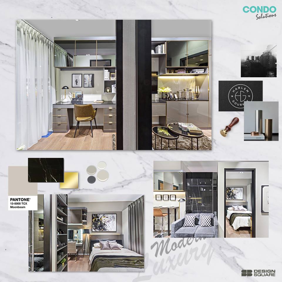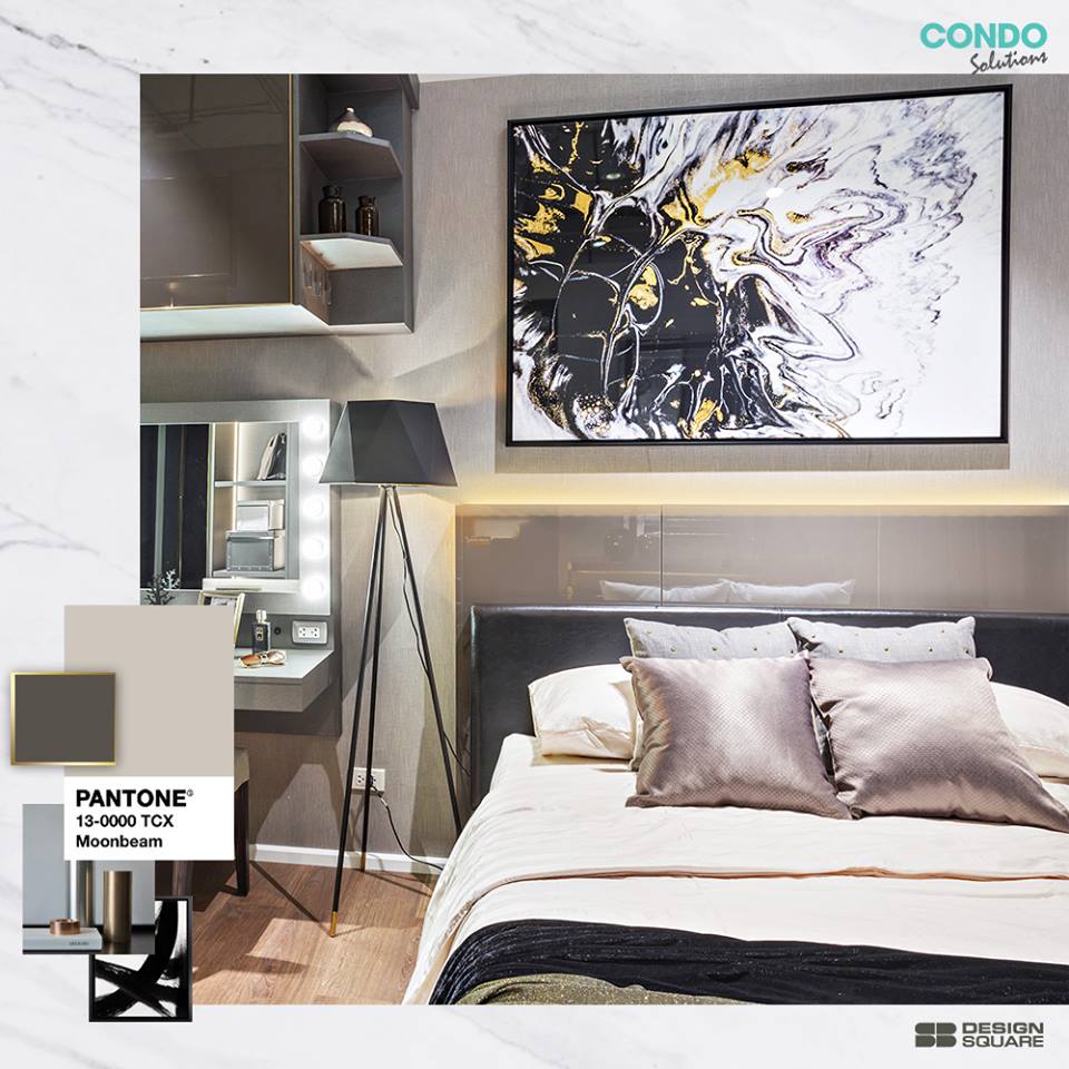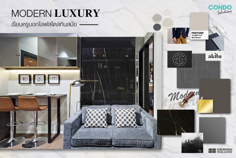 บ่งบอกความหรูหรามีระดับด้วยการตกแต่งสไตล์ Modern Luxury เป็นการออกแบบห้องในขนาด 33.5 ตร.ม. จัดเต็มด้วยการตกแต่งโดยการไล่ระดับเฉดสีเทา ครีม ตัดกับไฟ Warm Light ที่เมื่อมาผสมผสานกันแล้วดูอบอุ่น หรูหราอย่างมีสไตล์ รวมถึงมีการเล่นลวดลายด้วยวัสดุลายหินอ่อนตัดกับคริสตัลไฮกลอส และในส่วนของห้องนั่งเล่นแต่งด้วยผนังหลังโซฟาที่ใช้ Wall Instant ลายหินสีดำช่วยดึงความสมบูรณ์แบบในสไตล์ Luxury ได้เป็นอย่างดี สำหรับใครที่ชื่นชอบการตกแต่งห้องที่บ่งบอกถึงความมีระดับนี่เป็นอีกหนึ่งสไตล์ที่น่าสนใจมากครับ