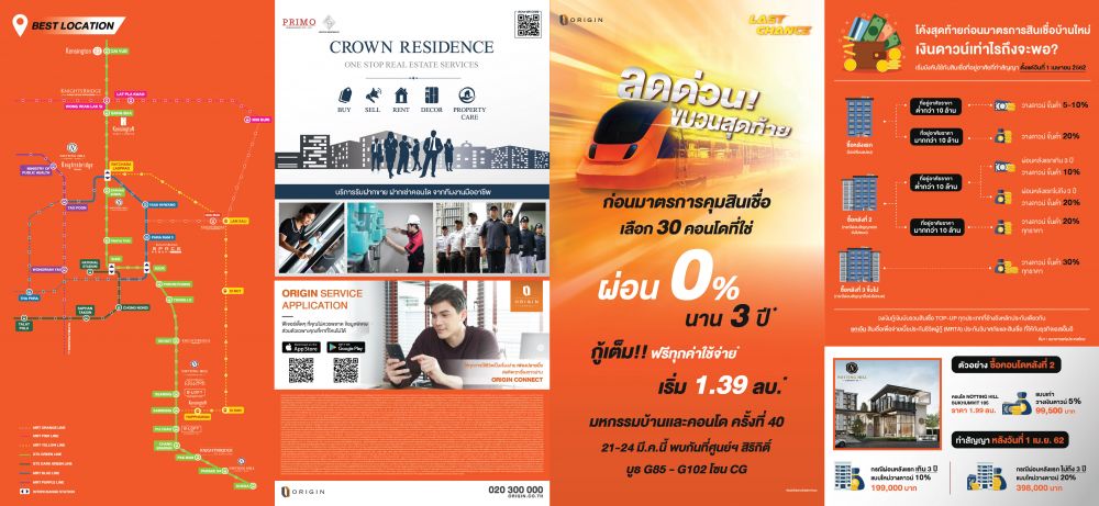 ด่วนมาก!! เลือกคอนโดที่ใช่ช่วงโค้งสุดท้าย ก่อนมาตรการคุมสินเชื่อจะบังคับใช้ในวันที่ 1 เม.ย.นี้ บริษัท ออริจิ้น พร็อพเพอร์ตี้ จำกัด (มหาชน) หรือ ORI ใจดีส่งโปรฯ ORIGIN LAST CHANCE !! "ลดด่วน ขบวนสุดท้าย" ราคาเริ่มต้นเพียง 1.39 ล้านบาท* ในงาน มหกรรมบ้านและคอนโดฯ ครั้งที่40 ระหว่างวันพฤหัสบดีที่ 21 - วันอาทิตย์ที่ 24 มีนาคม 2562 เวลา 10.00 - 20.00 น. บูธ G 85 – G 102 ณ ศูนย์การประชุมแห่งชาติสิริกิติ์