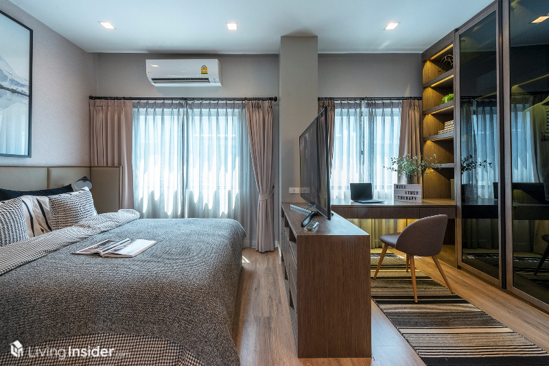 Master Bedroom ขนาดกำลังดี วางเตียงขนาด 5 ฟุต โต๊ะทำงานริมหน้าต่าง มีพื้นที่ให้สามารถแขวนทีวีติดผนังได้ มีห้องน้ำในตัวครบ ไม่ต้องใช้ร่วมกับใคร เป็นห้องนอนขนาดกำลังดีครับ อยู่คนเดียวได้สบายๆ