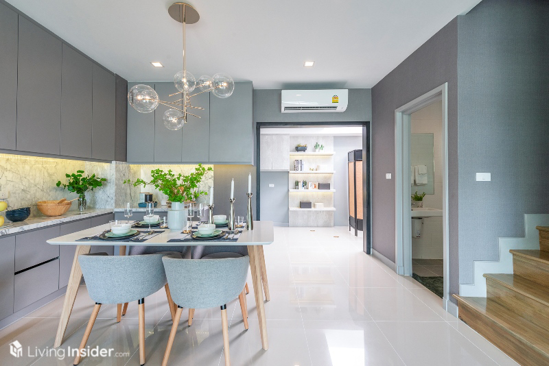 ถัดมาคือ โต๊ะรับประทานอาหาร 3-4 ที่นั่ง บิวท์อิน Pantry ทรง L-Shape ไว้มเตรียมอาหารเช้า ชงชา กาแฟ เพิ่มพื้นที่เก็บของได้มากกว่าเดิม