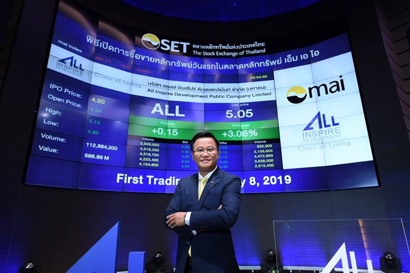 บมจ. ออลล์ อินสไปร์ ดีเวลลอปเม้นท์ ฤกษ์ดี ลงสนามเทรด mai วันแรก ไม่ทำให้ผู้ถือหุ้นและนักลงทุนผิดหวัง เปิดเทรด 4.94 บาท หรือ 0.82% จากราคา IPO 4.90 บาท เดินหน้าประกาศยกระดับการเป็นผู้พัฒนาและให้บริการด้านอสังหาริมทรัพย์เพื่อที่อยู่อาศัยแบบครบวงจร (Total Real Estate Solutions) ที่มุ่งเน้น โมเดลธุรกิจบน ความแตกต่างจากคู่แข่ง พร้อมตั้งเป้าอีกผงาดขึ้นแท่น Top 10