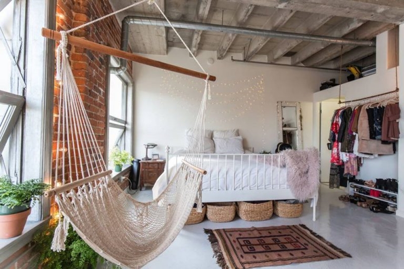 ใครว่าลอฟท์ต้องดิบอย่างเดียว ? ไม่ใช่เลยนะ ดูอย่างห้องในภาพนี้สิครับ เป็นการเอาสไตล์ลอฟท์มาผสมความนุ่มนวลของสีครีมและสีขาวได้ลงตัวมากเลยครับ เตียงสีขาว ผนังหัวเตียงสีขาว ผ้าปูที่นอนสีขาว และเฟอร์นิเจอร์หวายให้ความรู้สึกนุ่มนวล ส่วนเพดานเป็นปูนเปลือยโชว์การเดินท่อ และผนังริมหน้าต่างเป็นอิฐแดงเอกลักษณ์ของลอฟท์ ตัดด้วยเปลชิลล์ให้ฟิลพักผ่อนรับลมทะเล เรียกได้ว่ามิกซ์แอนด์แมทช์ได้สุดยอดจริงๆ ครับ