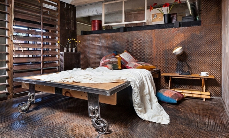 การแต่งห้องนอนแบบนี้จะต้องเป็นคนที่มีใจรักจริงๆ นะครับ ลองนึกถึงกลิ่นเหล็กและกลิ่นสนิมที่คละคลุ้งในห้องนอนสิ... ถ้าใจไม่รักจริงๆ นี่อยู่ไม่ได้แน่ๆ โดยห้องนอนสไตล์นี้จะเป็นการใช้แผ่นเหล็กพื้นเก่าของโรงงานมาทำเป็นผนัง ส่วนเตียงก็ใช้เป็นไม้แผ่นเก็บขอบเหล็ก ขาเตียงยังเป็นเหล็กอีก เรียกได้ว่าลอฟท์หนักและโหดมาก ใครที่ชอบดิบๆ สไตล์โรงงานก็จัดเลยครับ