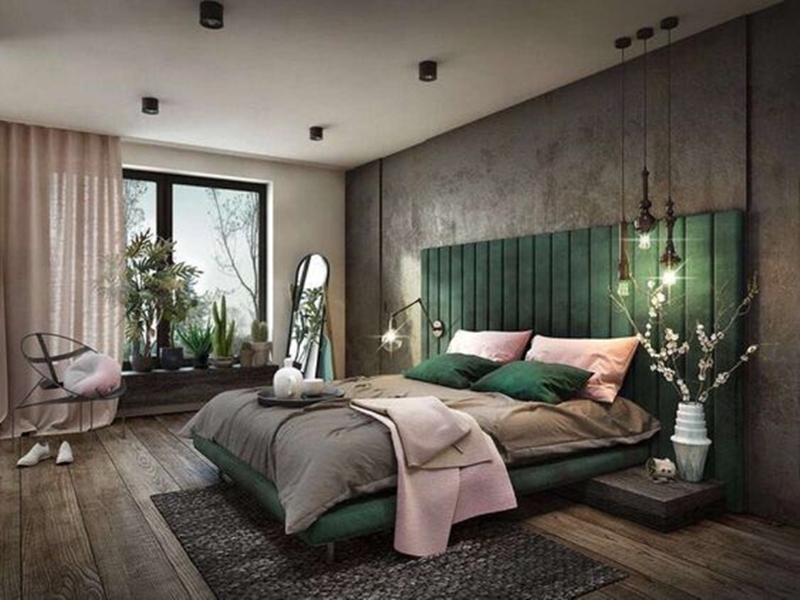 เพื่อนๆ คนไหนที่อยากมีต้นไม้ไว้ในห้องนอน อยากมีสีเขียวให้ความสดชื่นบ้าง ก็ต้องนี่เลยครับ ห้องนอนสไตล์ลอฟท์ผสมทรอปิคอล สองสไตล์นี้ดูไม่น่าเข้ากันได้เนอะ แต่พอจับมารวมแล้วกลับเข้ากันได้อย่างไม่น่าเชื่อ โดยเบสจะเป็นลอฟท์คือกำแพงปูนเปลือยขัดมันและพื้นไม้ แต่ผสมด้วยเตียงนอนสีเขียวและต้นไม้นานาพันธ์ุ ประดับรอบห้อง ดูแล้วผมยังหลงรักเลยเนี่ย