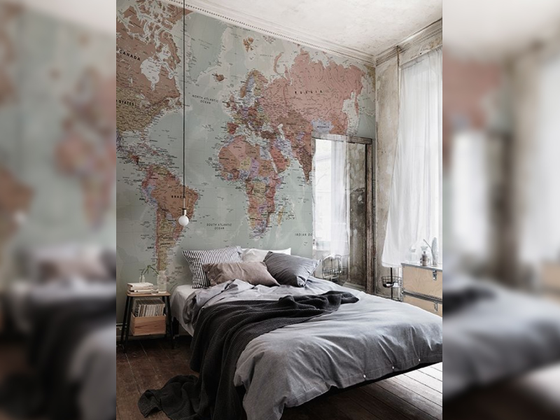 ใครที่อยู่บ้านปูนเก่าต้องทางนี้เลยครับ เพราะความเก่าและขลังของอาคารจะช่วยดึงเสน่ของสไตล์ลอฟท์ออกมาได้มากขึ้น อย่างในภาพจะเป็นบ้านปูนเก่าที่ติดวอลเปเปอร์แผนที่โลกแบบเต็มผนัง ผสมกับม่านโปร่งสีขาวพริ้วๆ และโคมไฟแบบลอฟท์ๆ เตียงก็เน้นคุมโทนสีเทา-น้ำตาล-ดำ ... เห็นไหมครับ บ้านเก่าไม่ใช่ปัญหาเลย กลับช่วยส่งให้ห้องดูลอฟท์กว่าเดิมอีกด้วย!